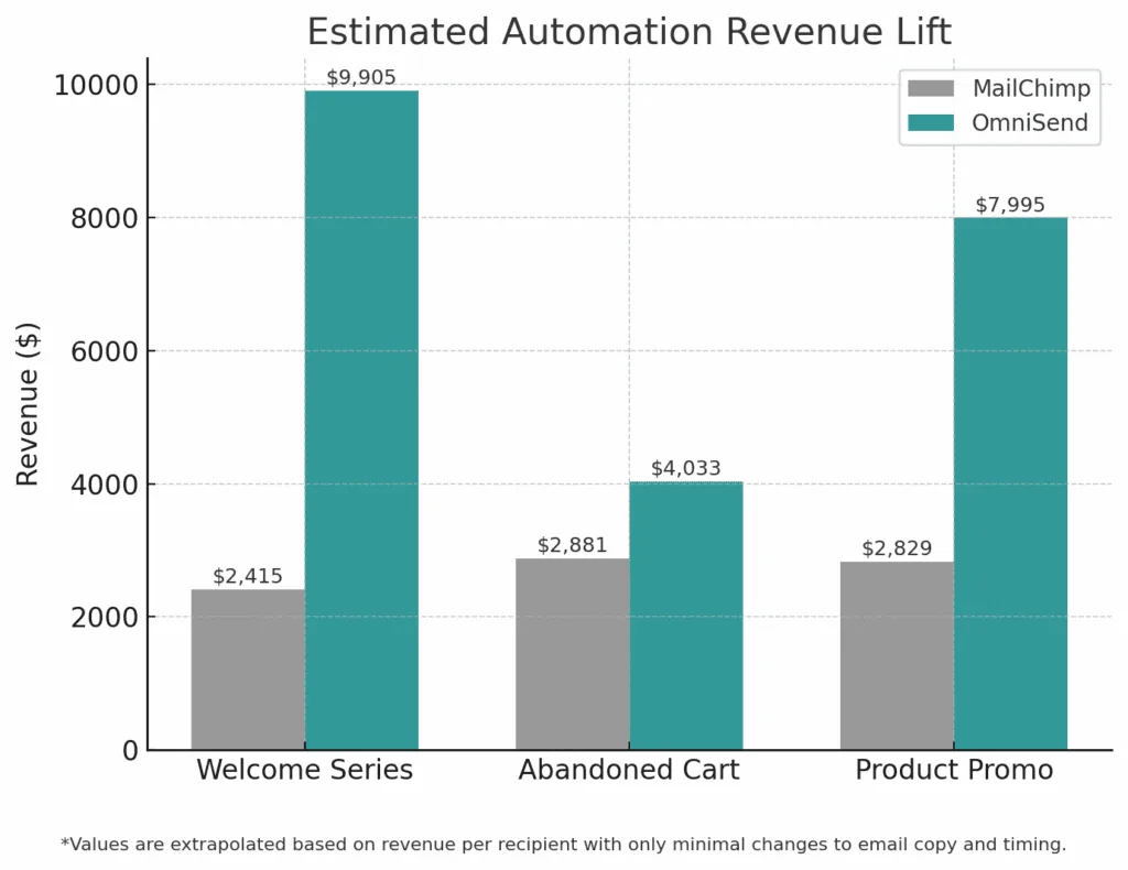 | 自动化流程 | 50 天邮件量 | MailChimp 每用户收入 | Omnisend 每用户收入 | MailChimp 收入(预估) | Omnisend 收入 | 提升 |