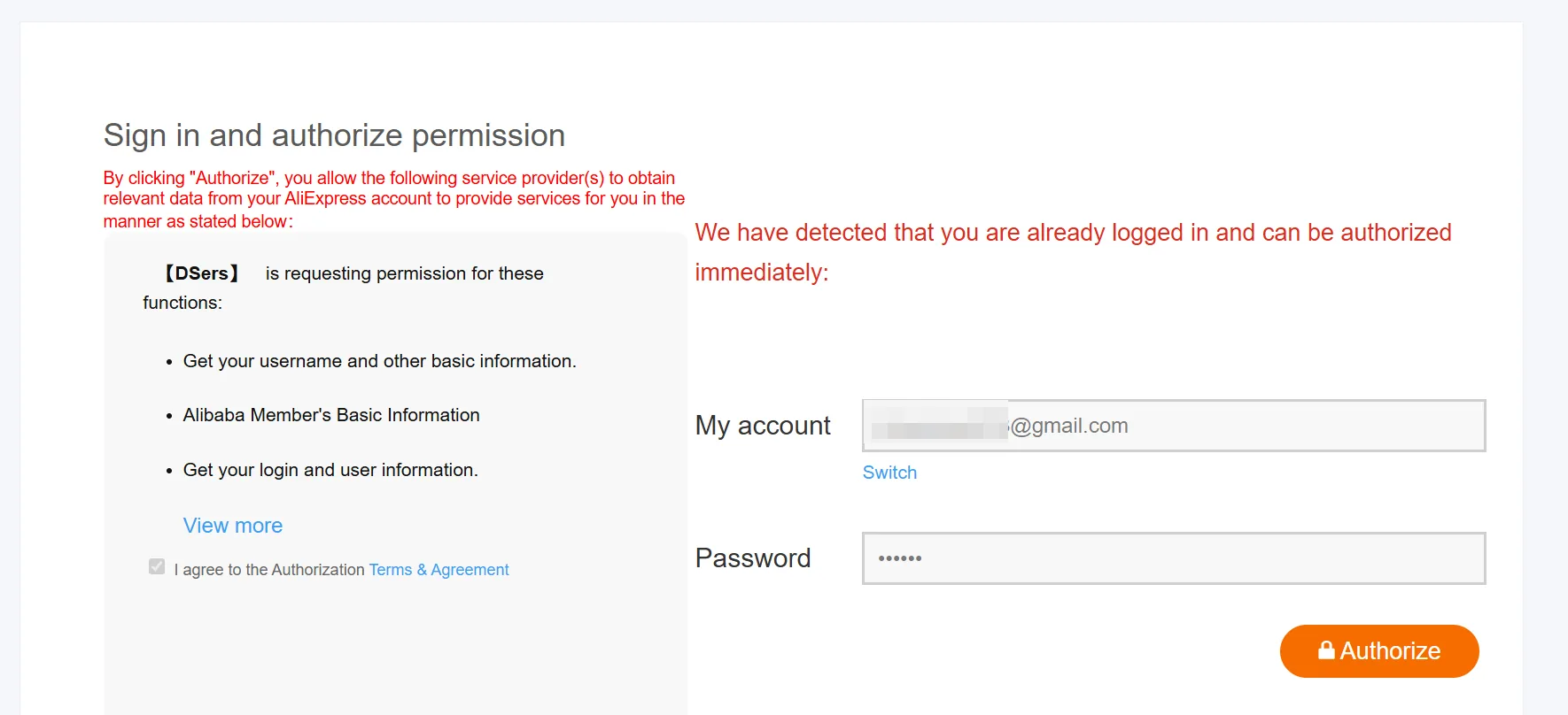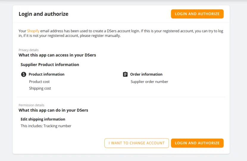 输入邮箱和密码,点击登录,然后点击授权。DSers将获得下单权限。